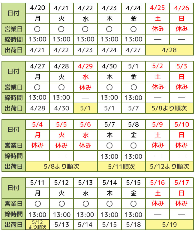 ゴールデンウィーク休業および出荷スケジュールのお知らせ