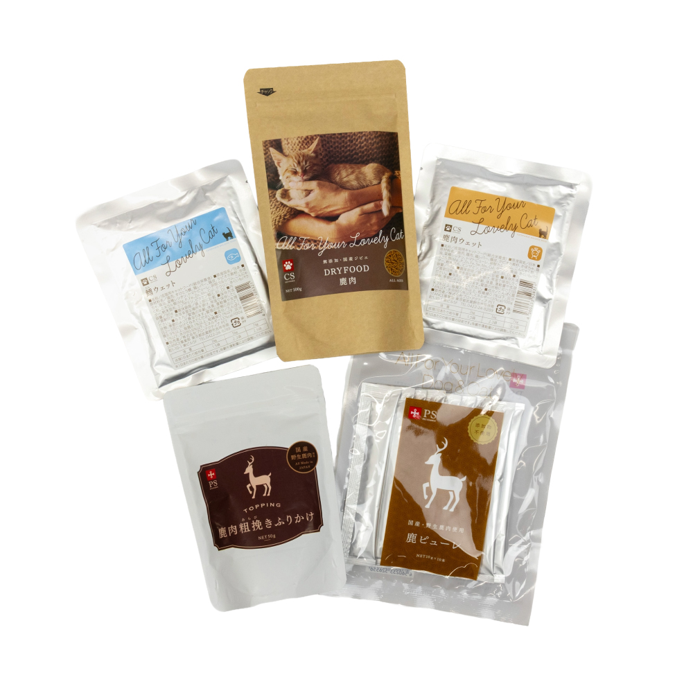 鹿肉、鶏肉、鶏レバー、鶏皮、タピオカ澱粉、かぼちゃ、鶏油、菜種レシチン、トマトピューレ、卵殻カルシウム、こんにゃく粉、ミネラル類(Mg、P、Zn、Fe、Se、Mn、Cu)、タウリン、魚油、きくいもパウダー、粉末昆布、エンザミン、ビタミン類(E、B1、D)