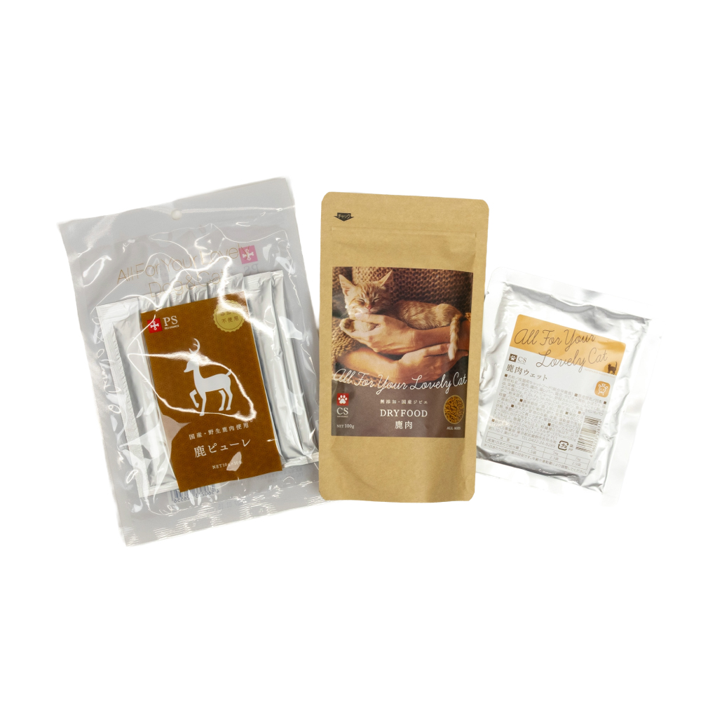 鹿肉、鶏肉、鶏レバー、鶏皮、タピオカ澱粉、かぼちゃ、鶏油、菜種レシチン、トマトピューレ、卵殻カルシウム、こんにゃく粉、ミネラル類(Mg、P、Zn、Fe、Se、Mn、Cu)、タウリン、魚油、きくいもパウダー、粉末昆布、エンザミン、ビタミン類(E、B1、D)