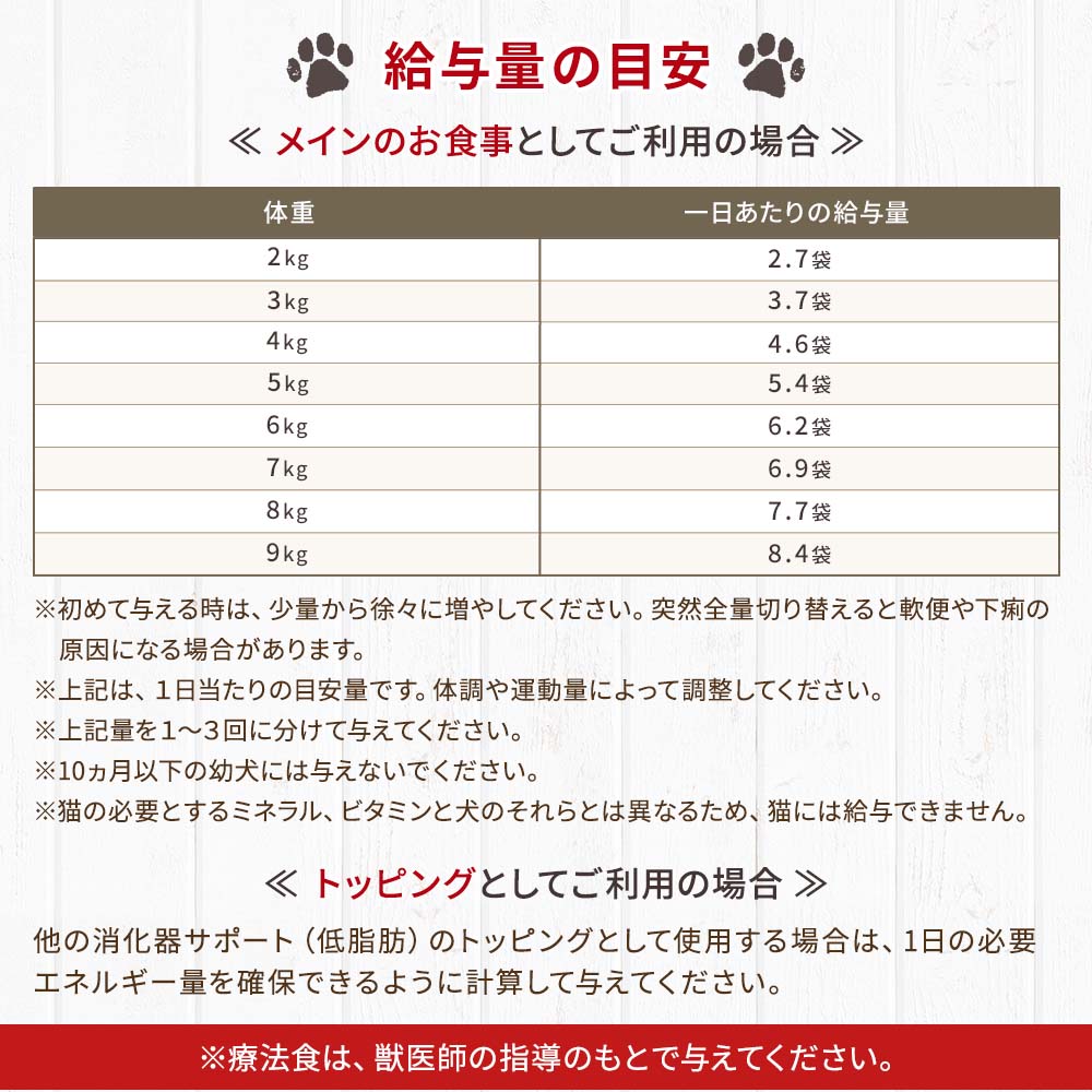 他の消化器サポート(低脂肪)のトッピングとして使用する場合は、1日の必要エネルギー量を確保できるように計算して与えてください。