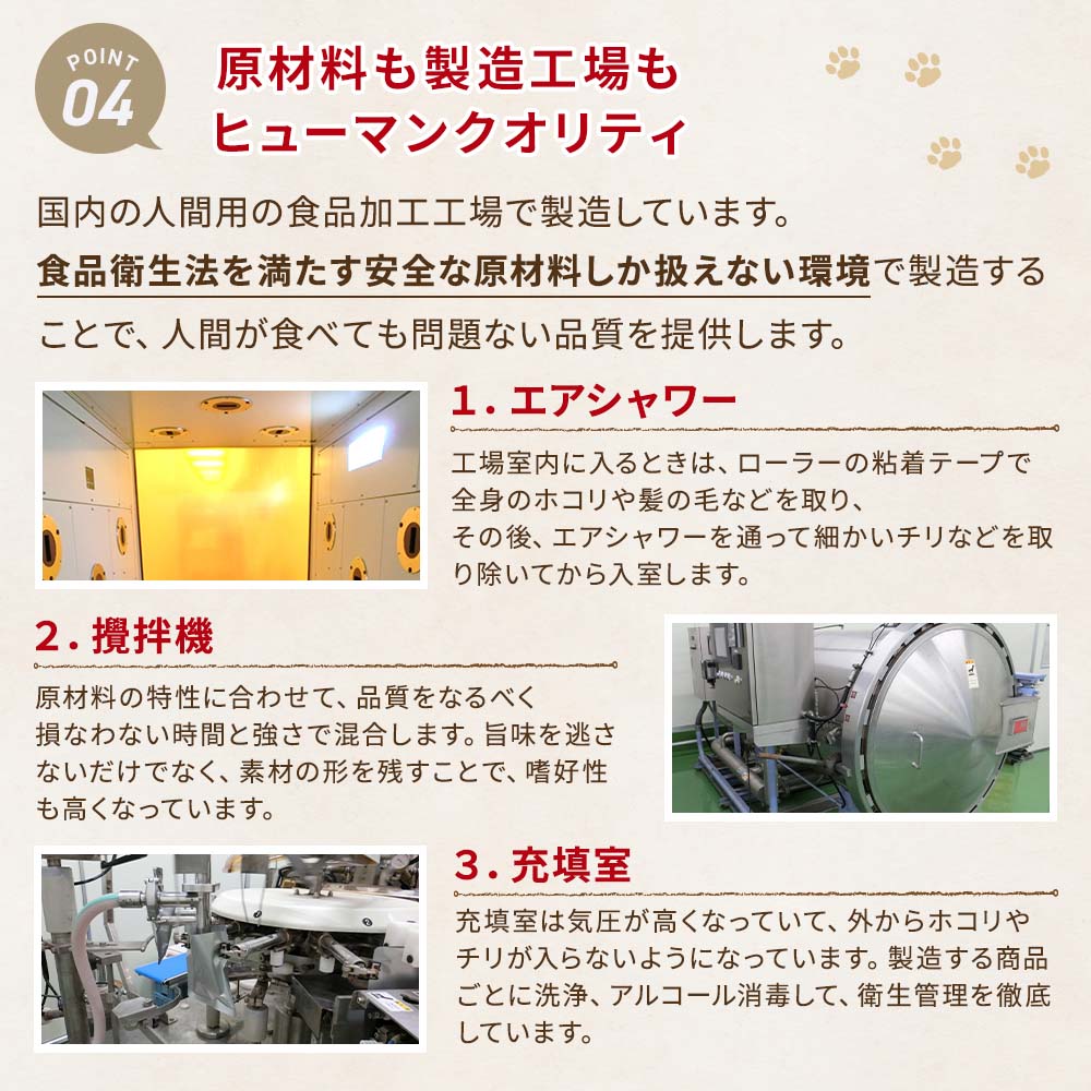 国内の人間用の食品加工工場で製造しています。食品衛生法を満たす安全な原材料しか扱えない環境で製造することで、人間が食べても問題ない品質を提供します。