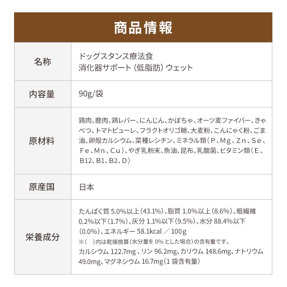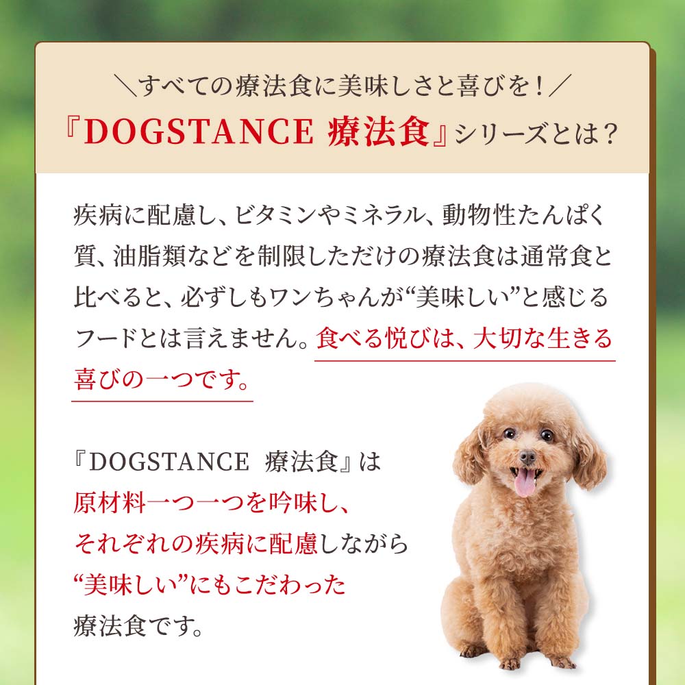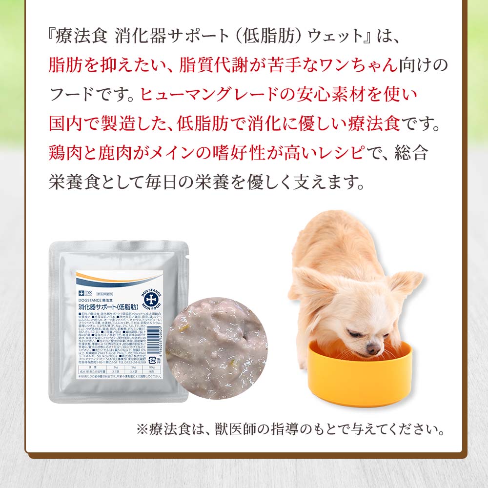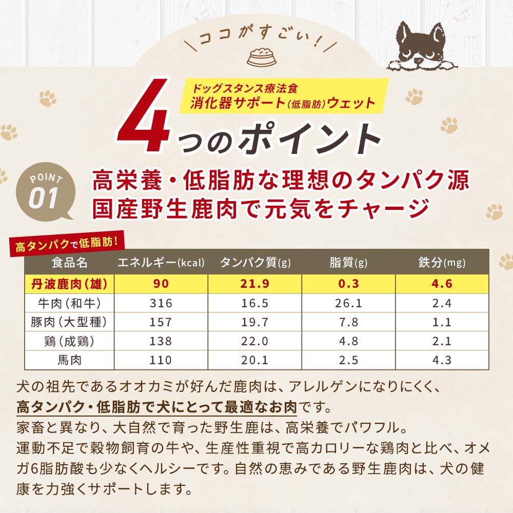 ドッグスタンスの「消化器サポート(低脂肪)ウェット」は、デリケートな愛犬のために、美味しさと安心安全を追求した国産の療法食です。