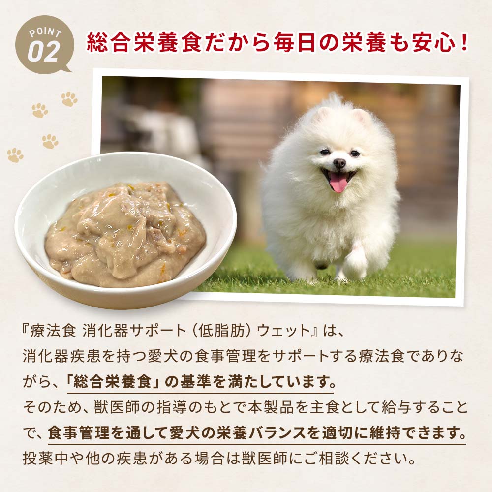 『療法食 消化器サポート(低脂質)ウェット』は、消化器疾患を持つ愛犬の食事管理をサポートする療法食でありながら、「総合栄養食」の基準を満たしています。