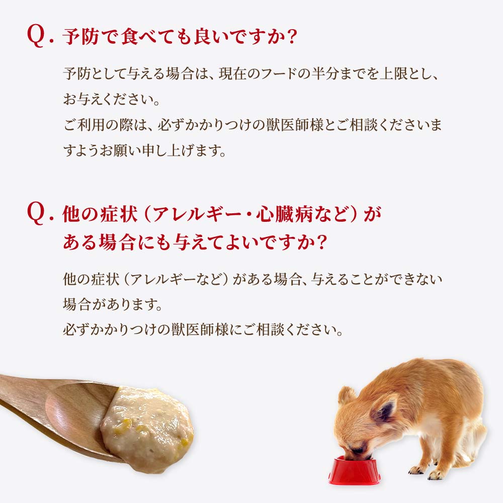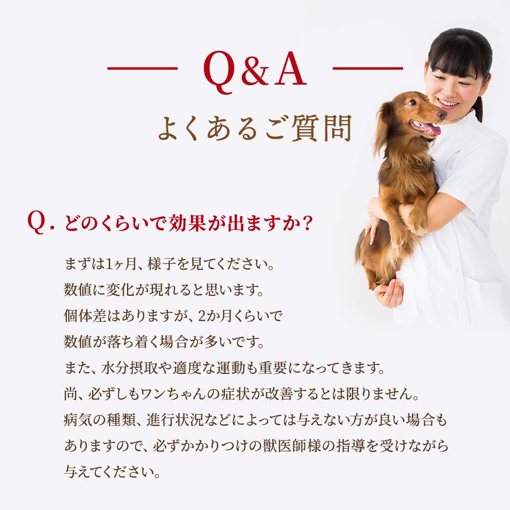 そのため、獣医師の指導のもと、水と本製品を与えるだけで、必要な栄養バランスをしっかり摂取でき、長期的な健康維持に役立ちます。投薬中や他の疾患がある場合は獣医師にご相談ください。