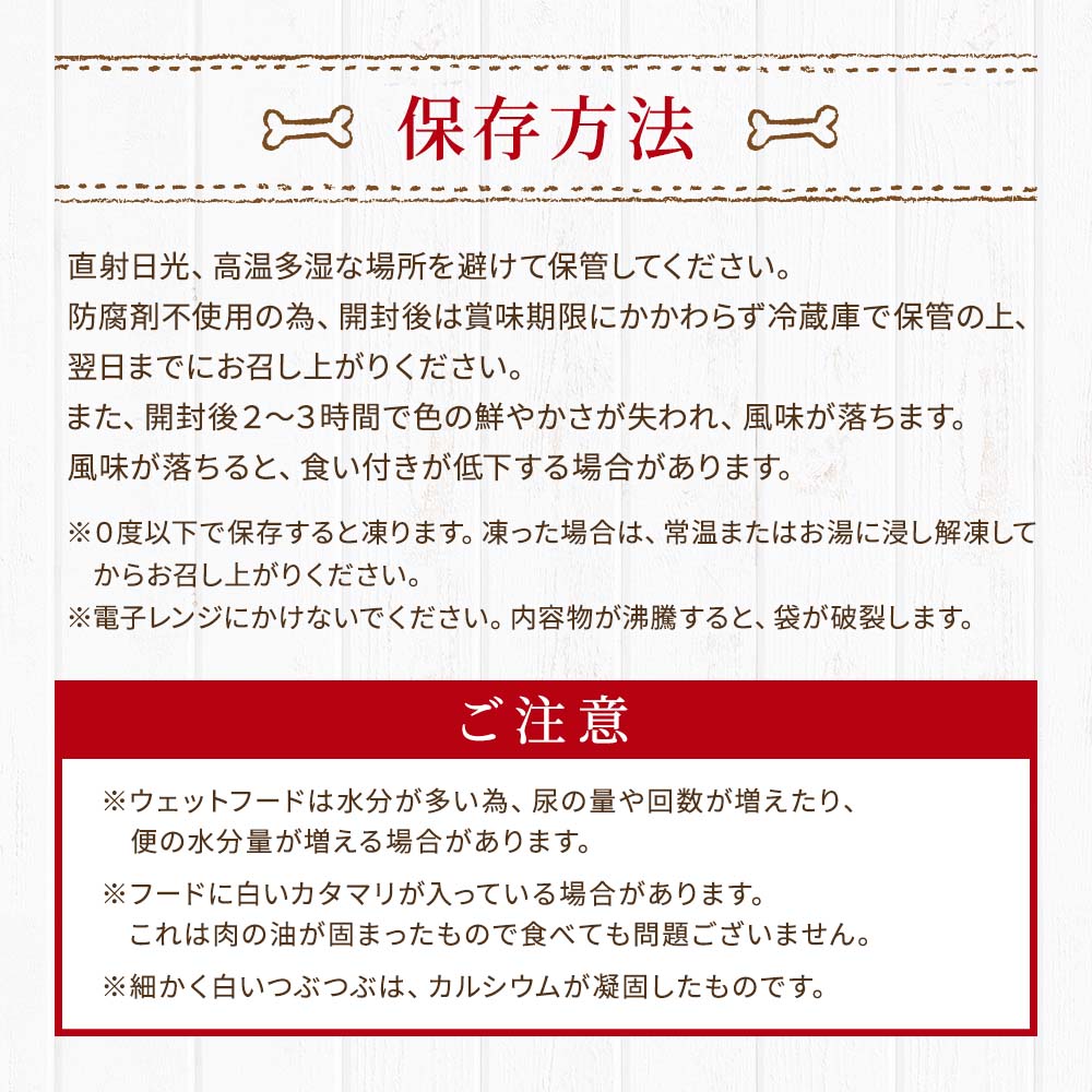 また、着色料、保存料、香料、酸化防止剤、増粘剤は一切使用していません。デリケートな愛犬のために、腸に優しい無添加設計です。
