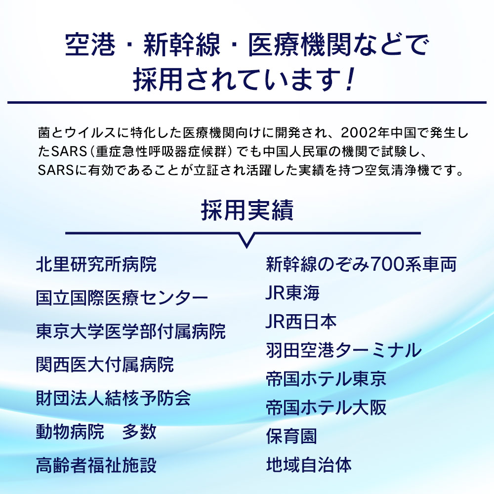 1パス(1回通過)で、インフルエンザウイルス99.4%以上・BCG株(結核菌)99.0%以上を除去できます。