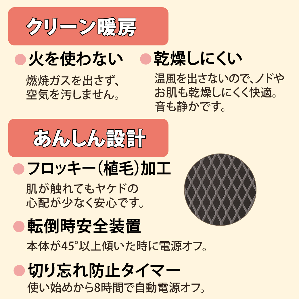 - 安全装置・・・転倒時安全装置、 温度過昇防止装置(サーモスタット、温度ヒューズ)、電流ヒューズ、切り忘れ防止タイマー(8時間)