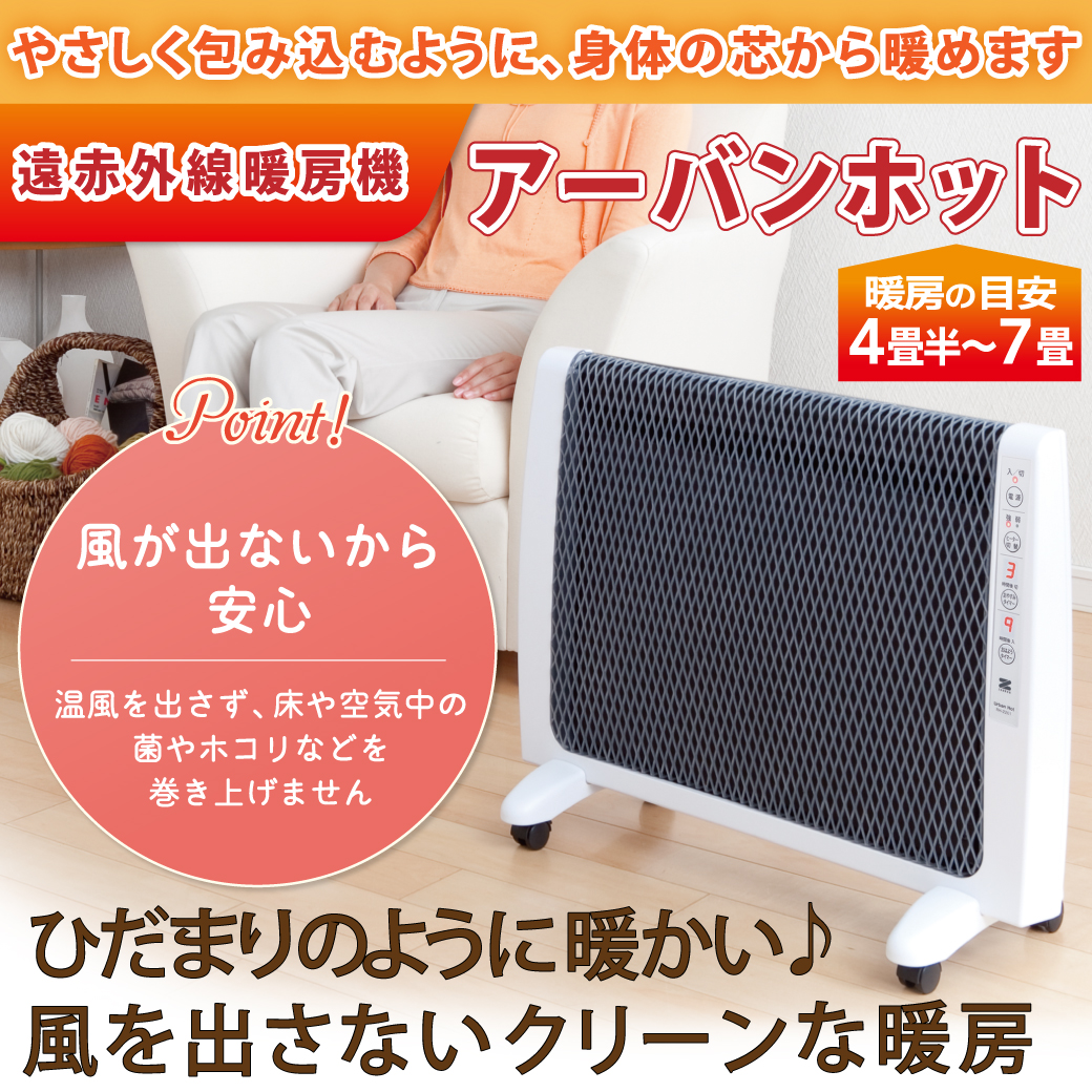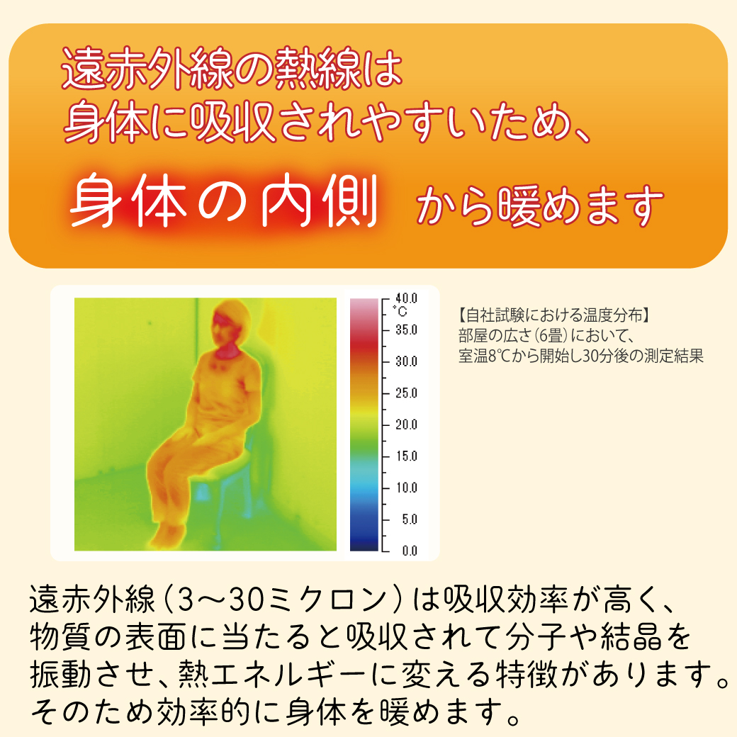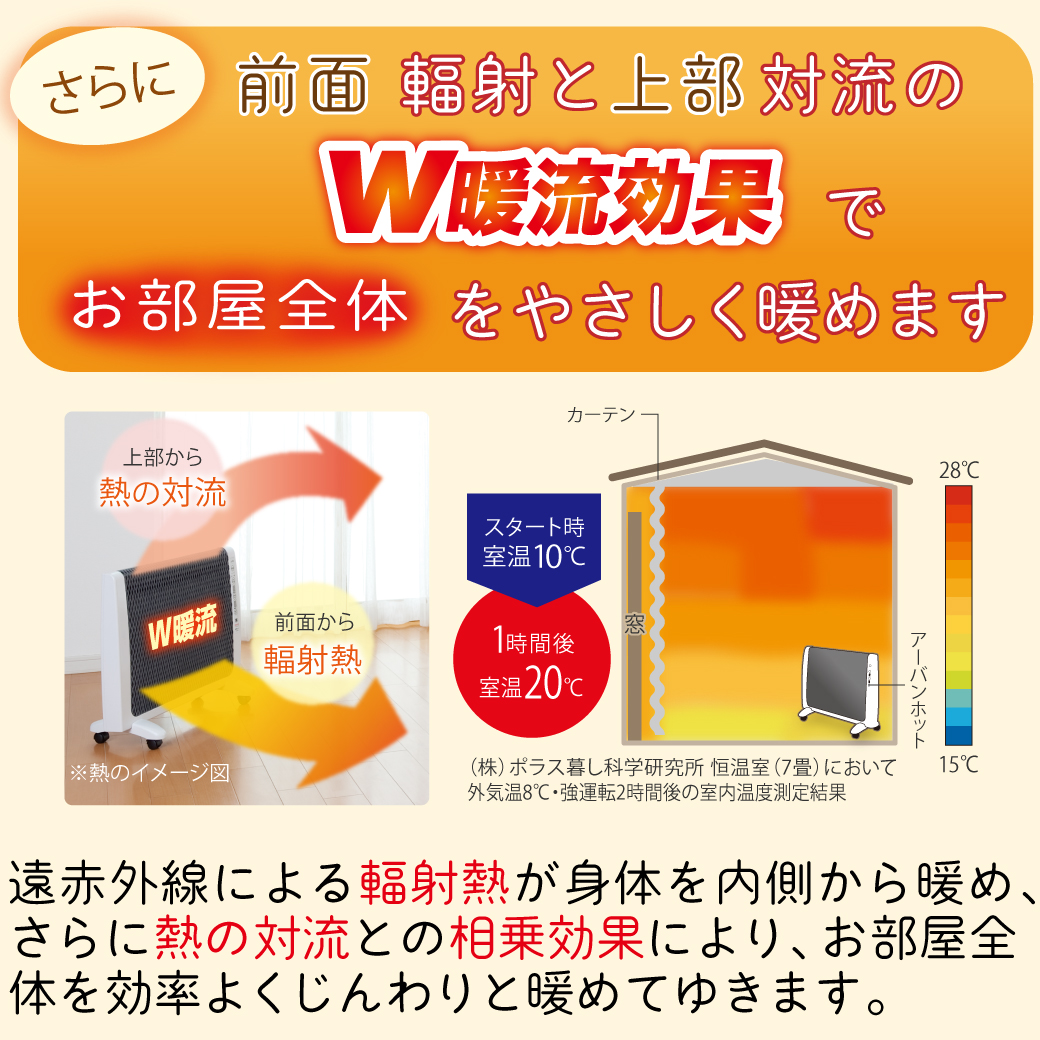 アーバンホットの遠赤外線による輻射熱は、身体の内側に温もりを伝えるので、まるでひだまりの中にいるような自然な暖かさが感じられます。 前面輻射と上部対流のW暖流効果でお部屋全体をやさしく暖めます。 遠赤外線による輻射熱が身体を内側から暖め、さらに熱の対流との相乗効果により、お部屋全体を効率よくじんわりと暖めてゆきます。