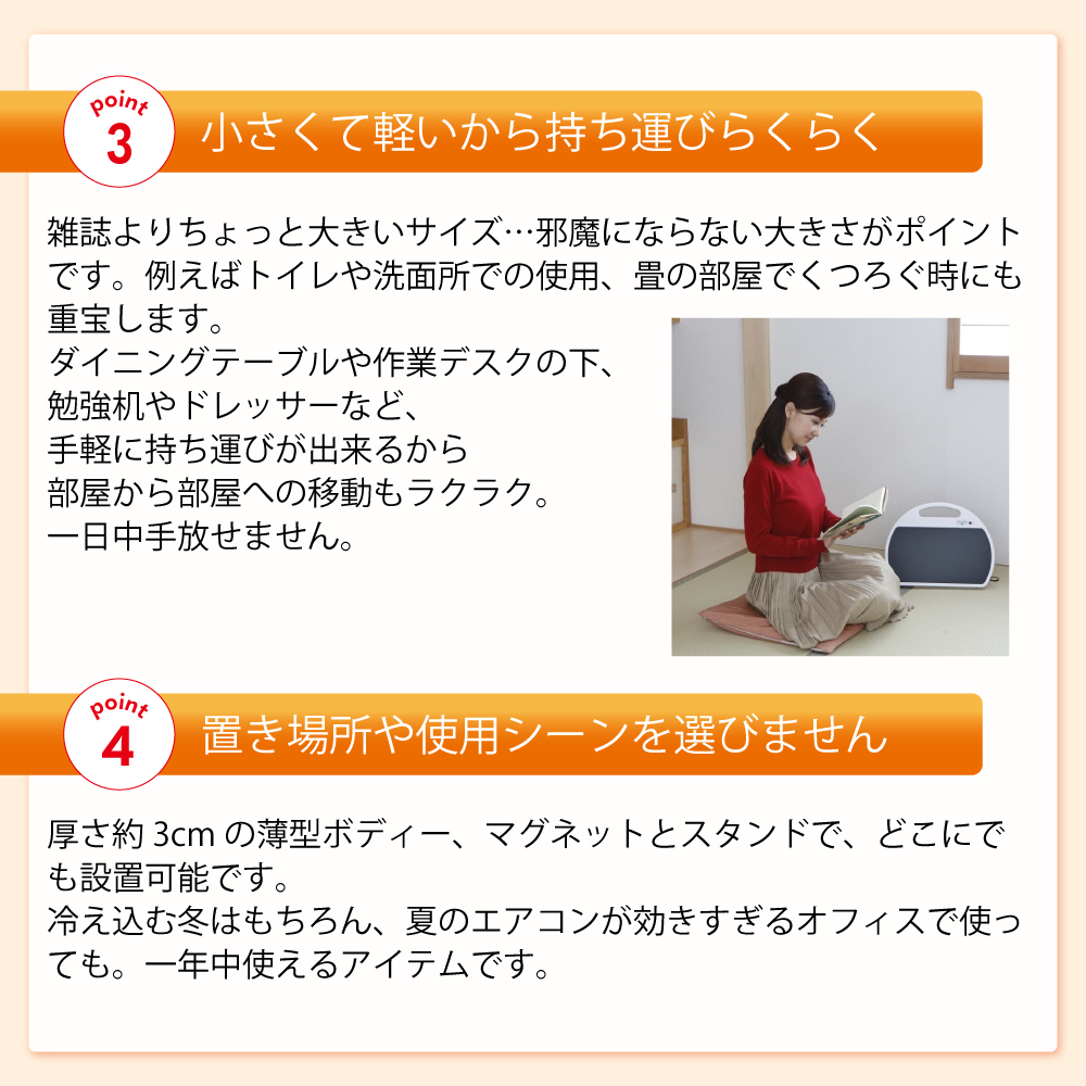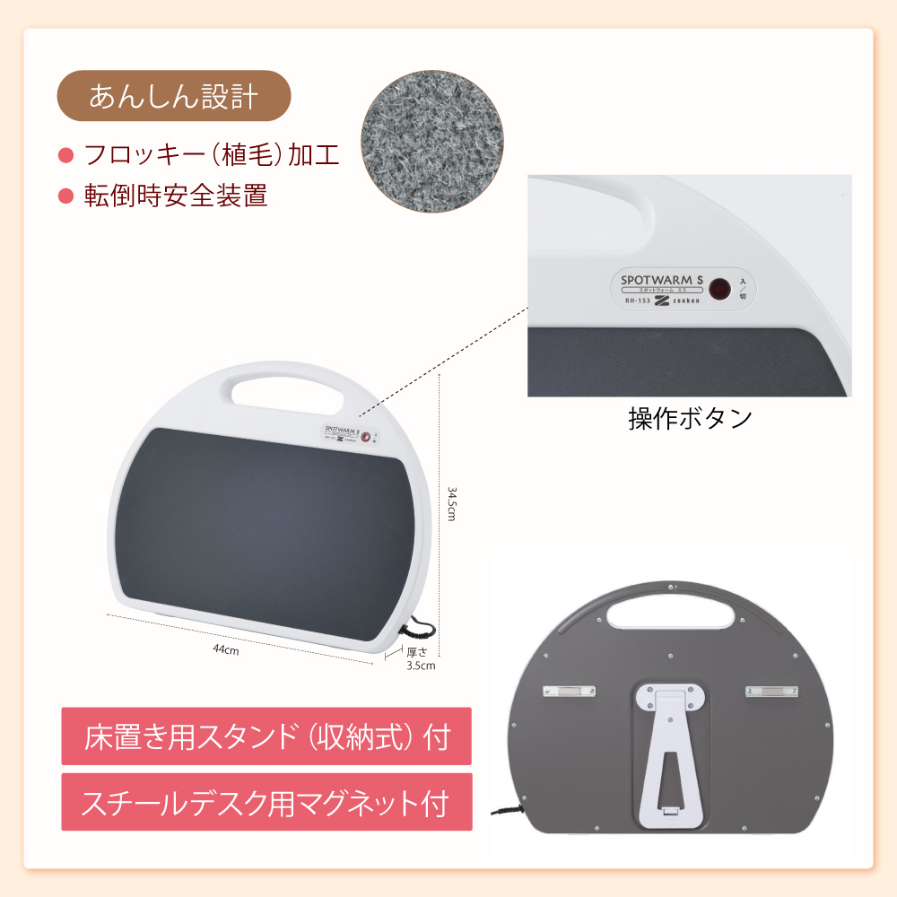 - 付属機能:スチールデスク取付け用マグネット・床置き用スタンド(収納式)