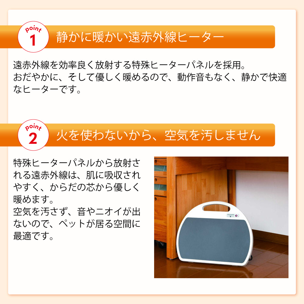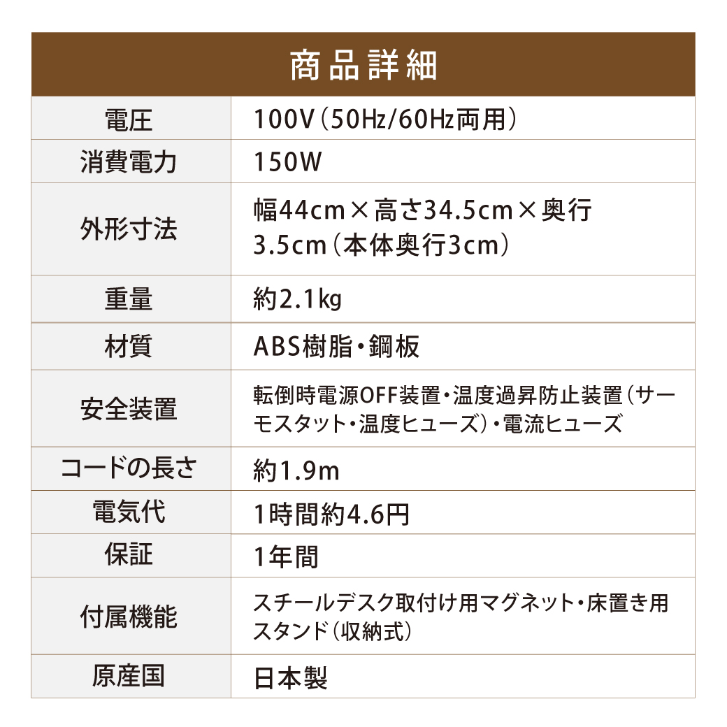 - 安全装置:転倒時電源OFF装置・温度過昇防止装置(サーモスタット・温度ヒューズ)・電流ヒューズ